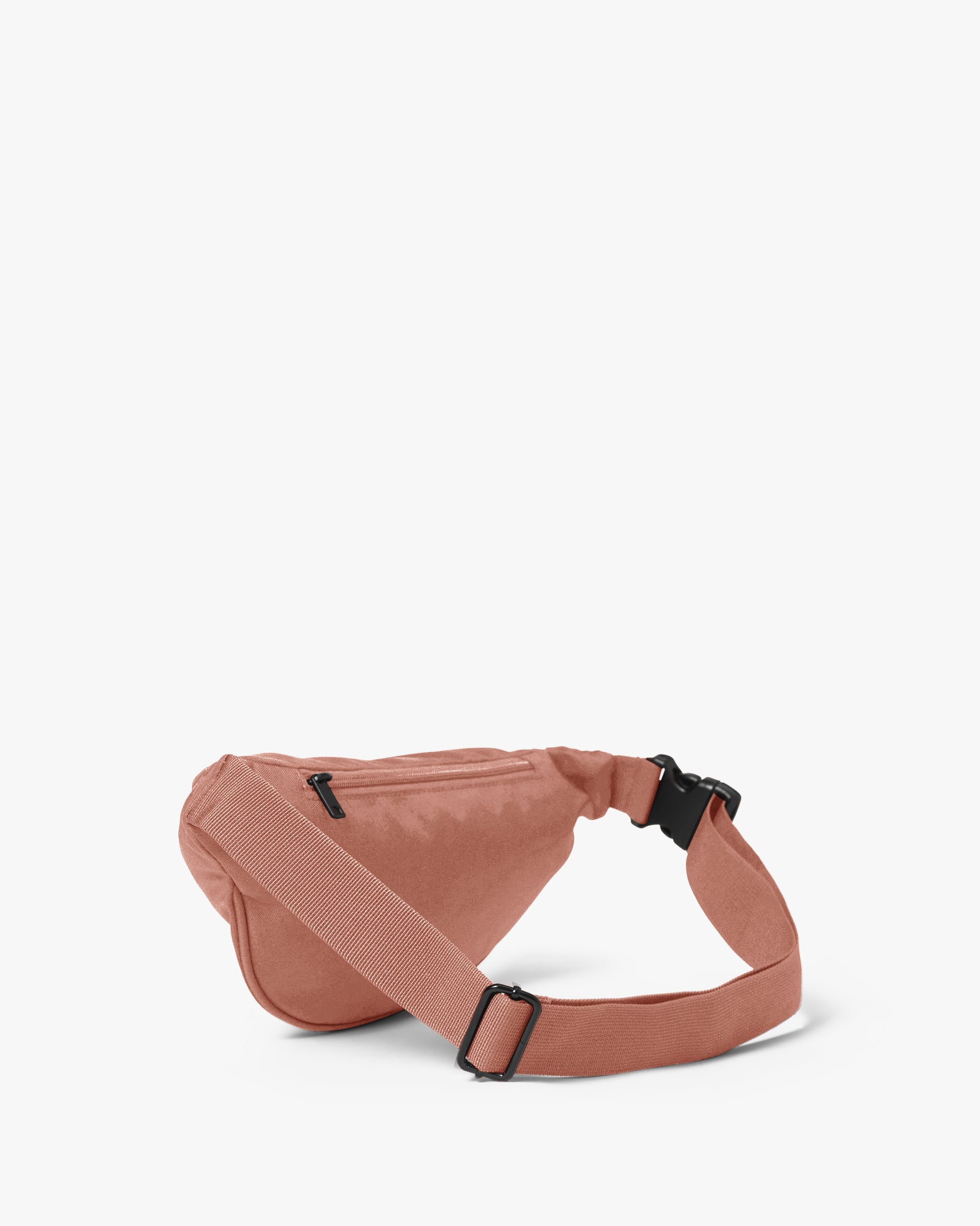 This functional bum bag blends a tonal design with practical features. It has an adjustable strap with buckle, allowing it to be worn around the waist or as a crossbody. The main compartment closes with a zip and includes an inner pocket, along with an extra zipped pocket at the back. The outer fabric and lining are made from 100% certified recycled materials, and the bag holds up to 1.5 litres.