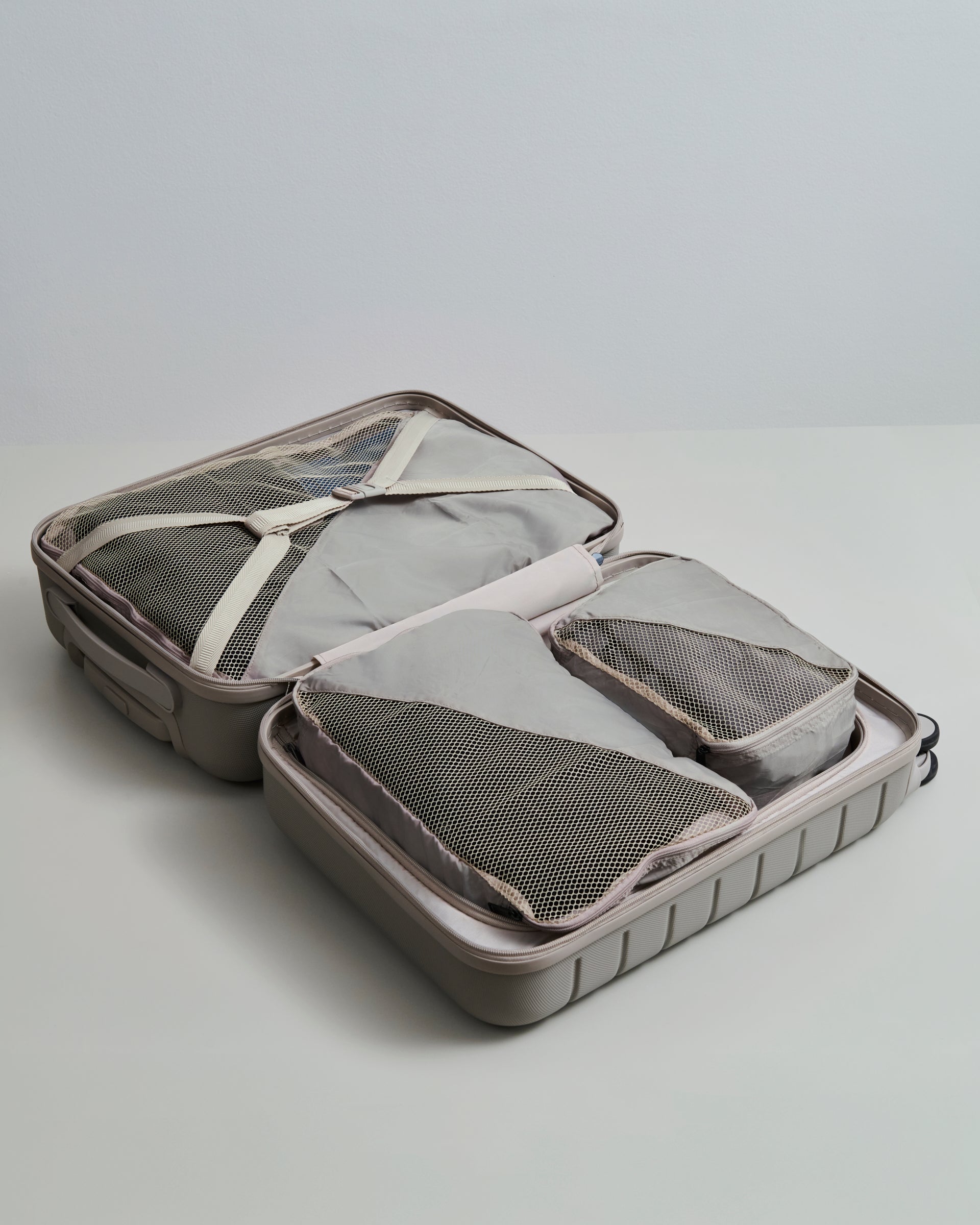 This set of packing cubes includes sizes S, M, and L, designed to help you organize your belongings when packing your suitcase. The main fabric are made of lightweight certified recycled materials and feature zipper closures. Each packing cube is equipped with a mesh top for easy visibility of your packed items.