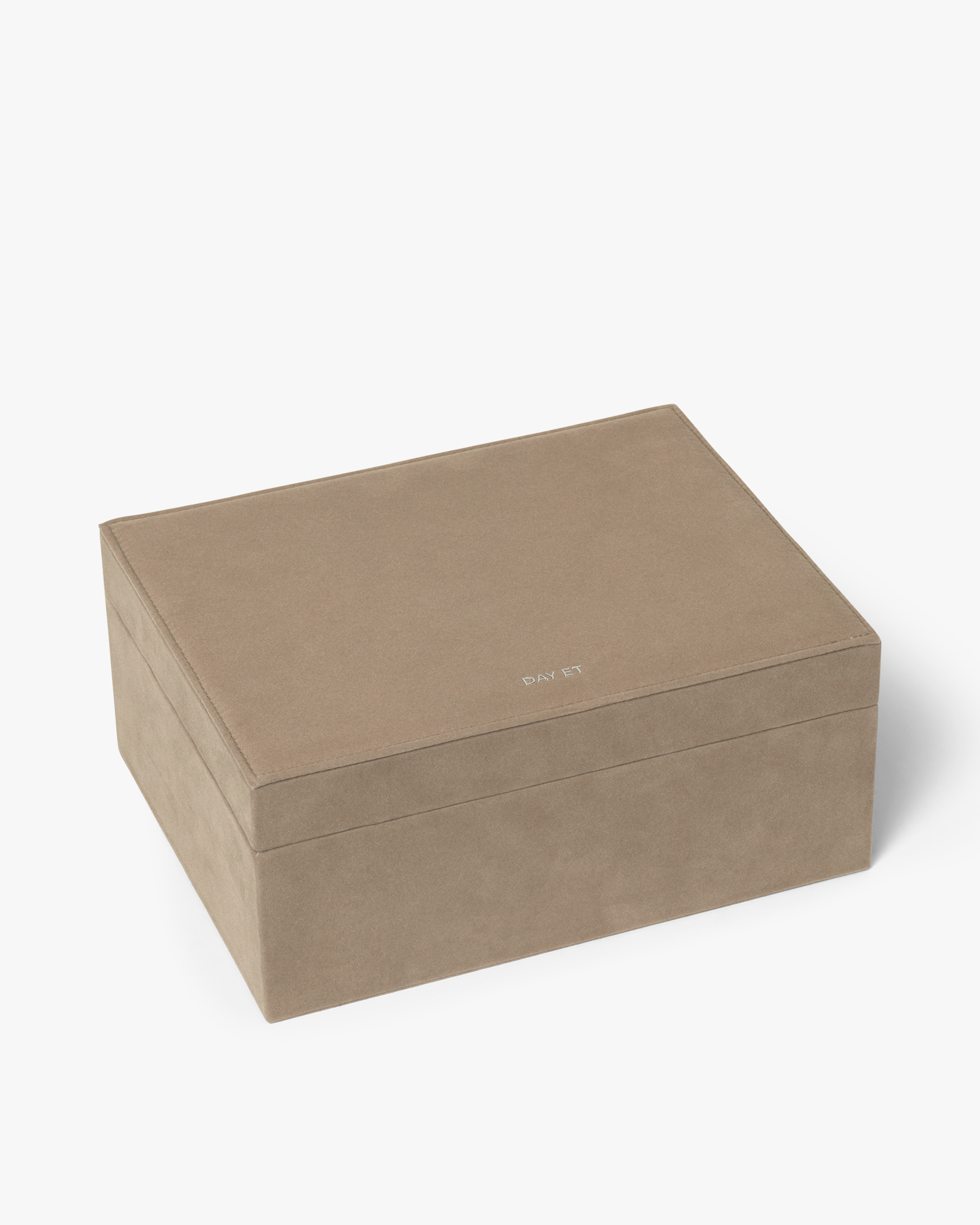 This spacious jewellery box is perfect for storing all your jewellery. It is designed in velvet and has the Day Et logo in silver on the front. It has a magnetic closure, and inside, there are multiple functional compartments for organizing your jewelry. Additionally, it includes a removable tray that offers an extra compartment for storing your pieces.