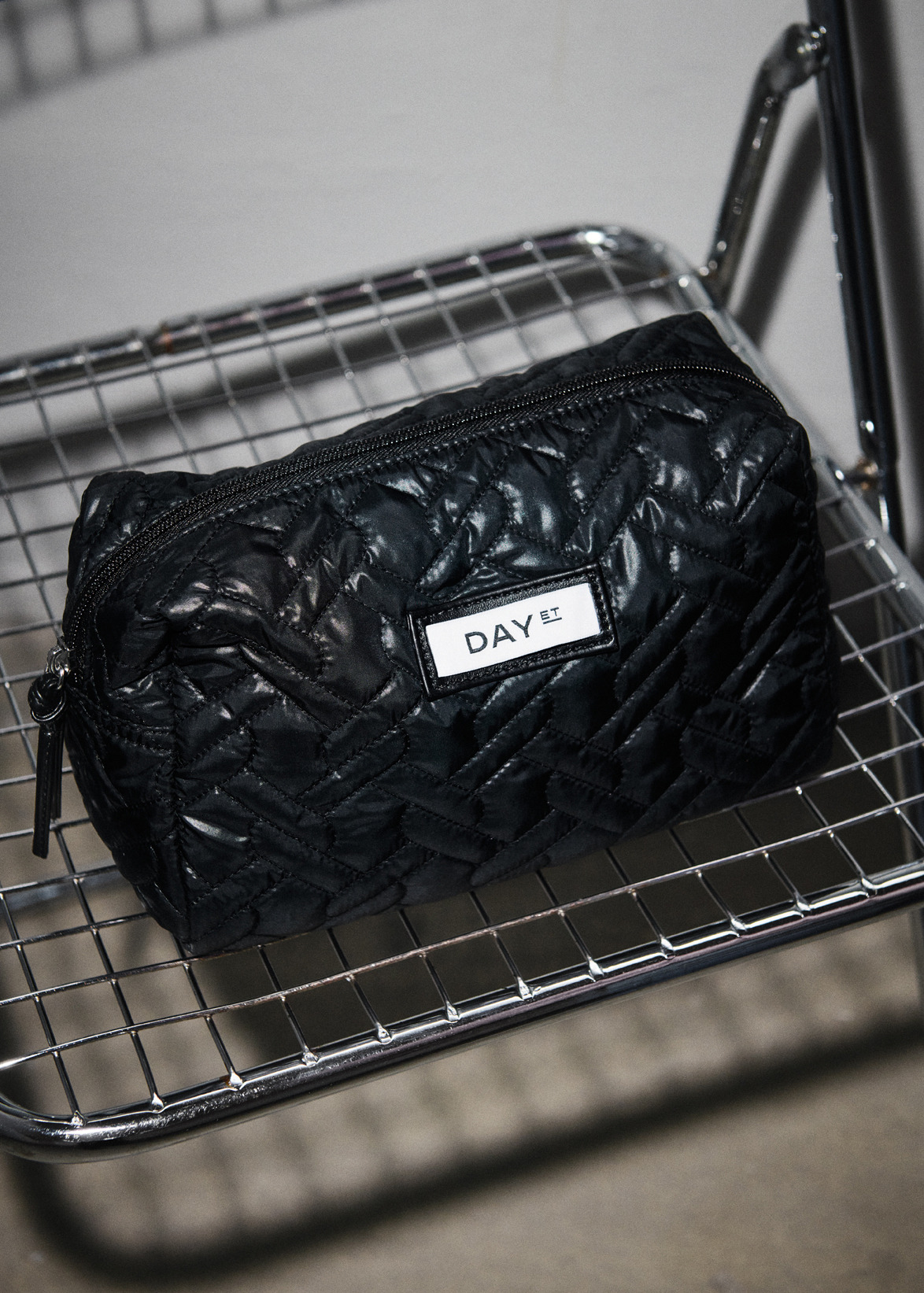 This toiletry bag can store all of your beauty products both at home and when you're on the go, and it is designed in a quilt. The outer fabric and inner lining is made of 100% certified recycled material. It is closed with a zipper, and it has two inside pockets, where you can keep your smaller products.