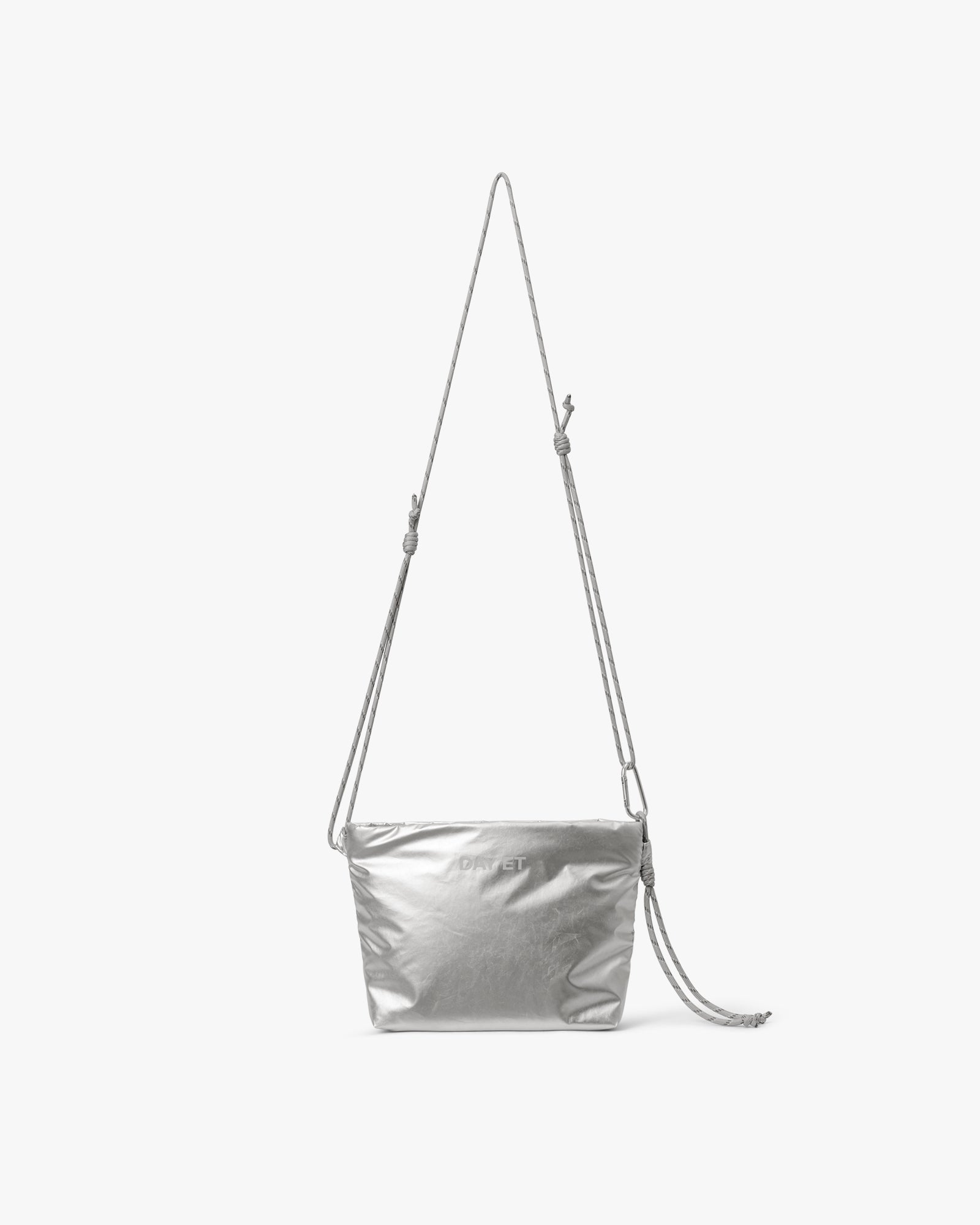A compact crossbody made from padded, shiny material, featuring a practical mesh divider inside the main compartment. It closes with a recessed zip and paracord pull, while the adjustable strap offers a flexible fit. The carabiner makes it easy to remove quickly — ideal for days on the go or when attaching it to another bag.