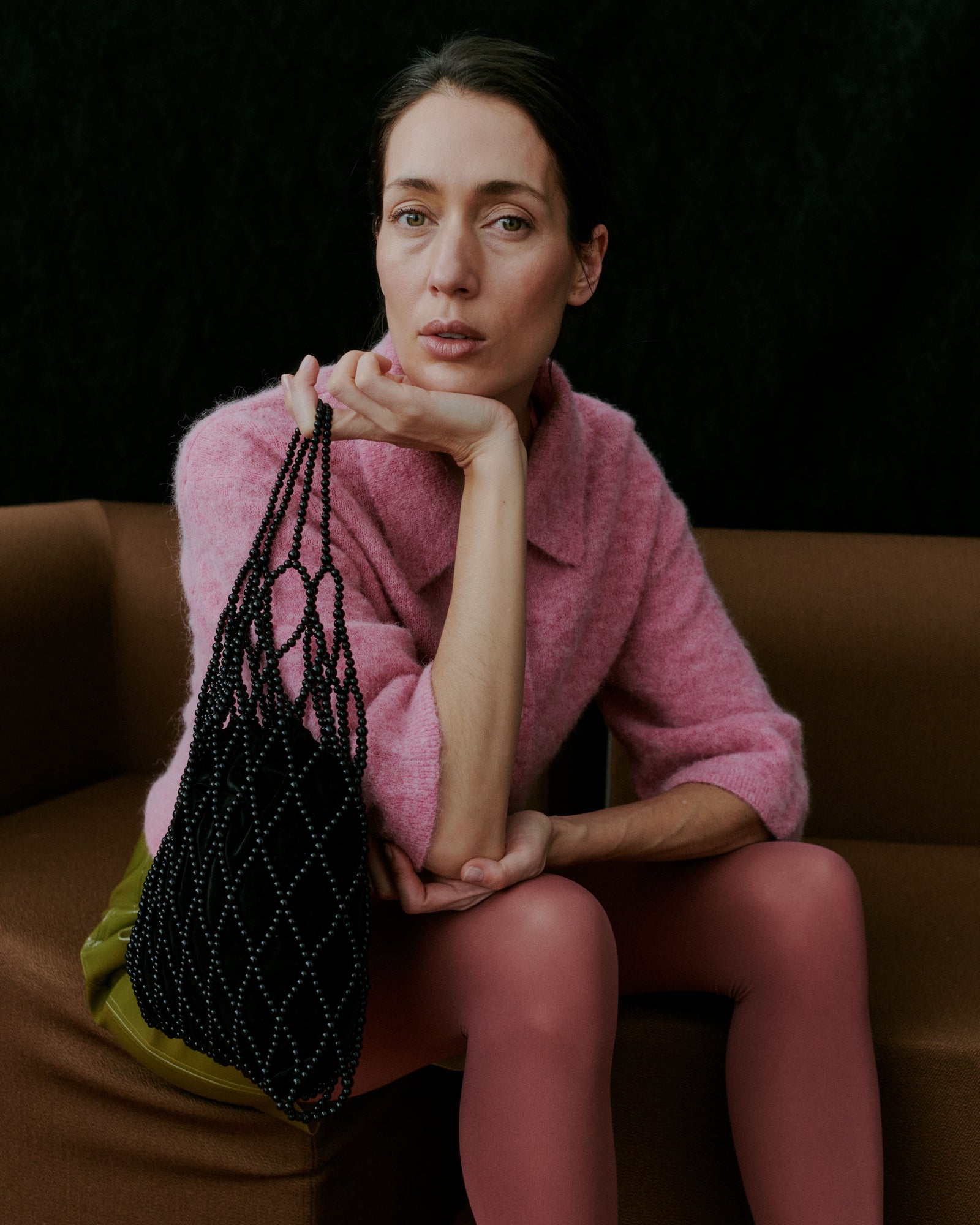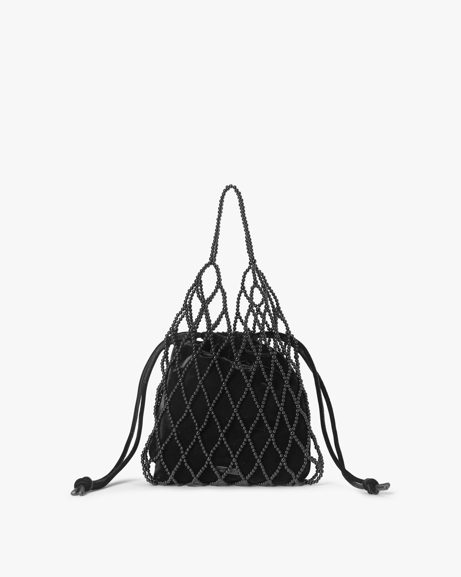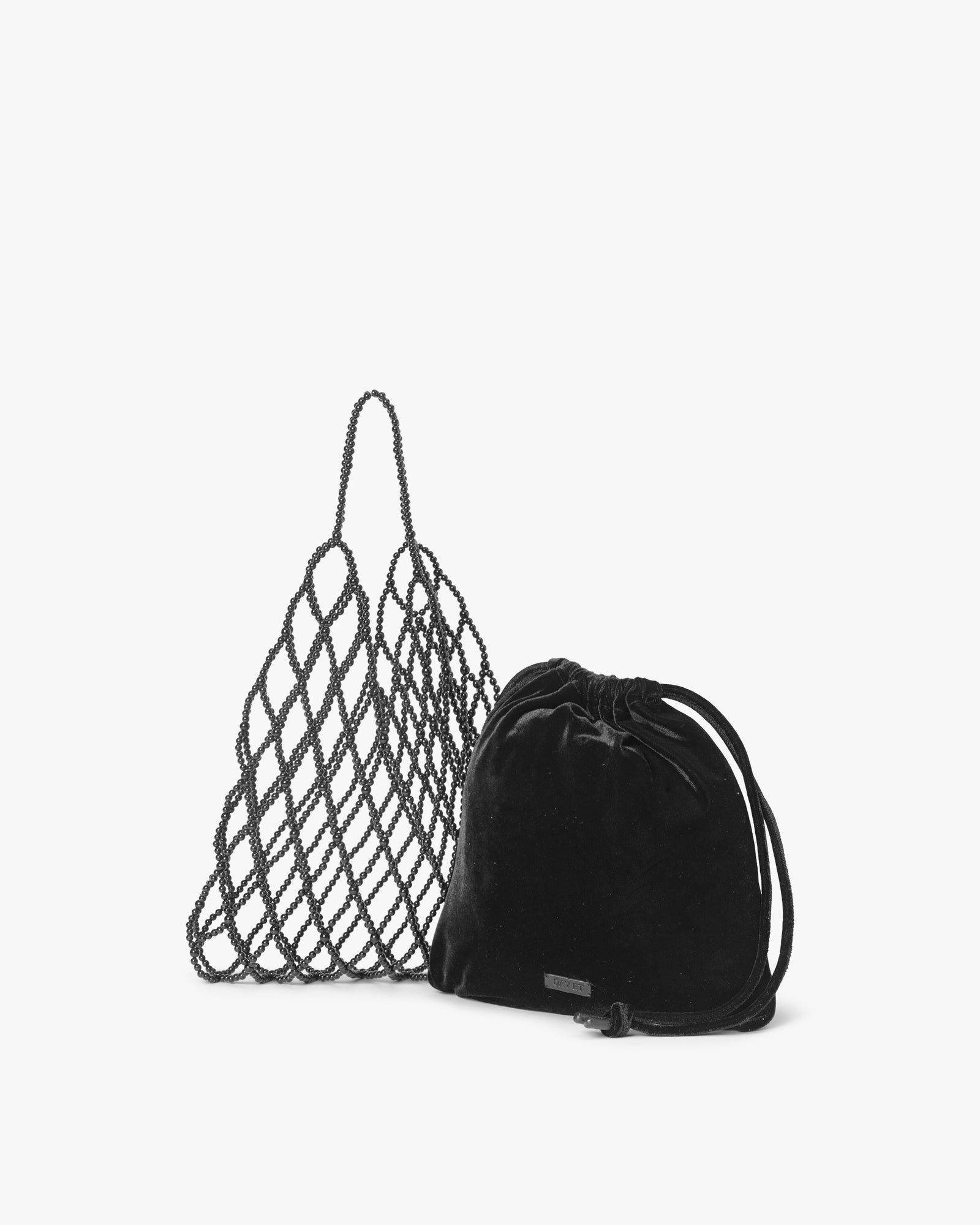 This elegant bag is crafted from black beads in a lightweight net design. Inside, a soft velvet pouch with a drawstring closure keeps your belongings in place. It can be carried by hand or over the shoulder – a playful and decorative choice for both everyday and festive occasions.