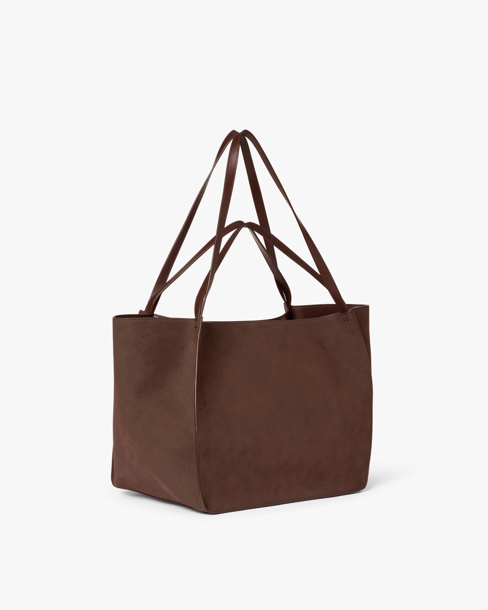 This spacious shoulder bag has a sculptural shape and is made from soft faux suede with faux leather details. It has both handles and shoulder straps, as well as a firm base that provides structure. Inside, it has a light twill lining and an open pocket.