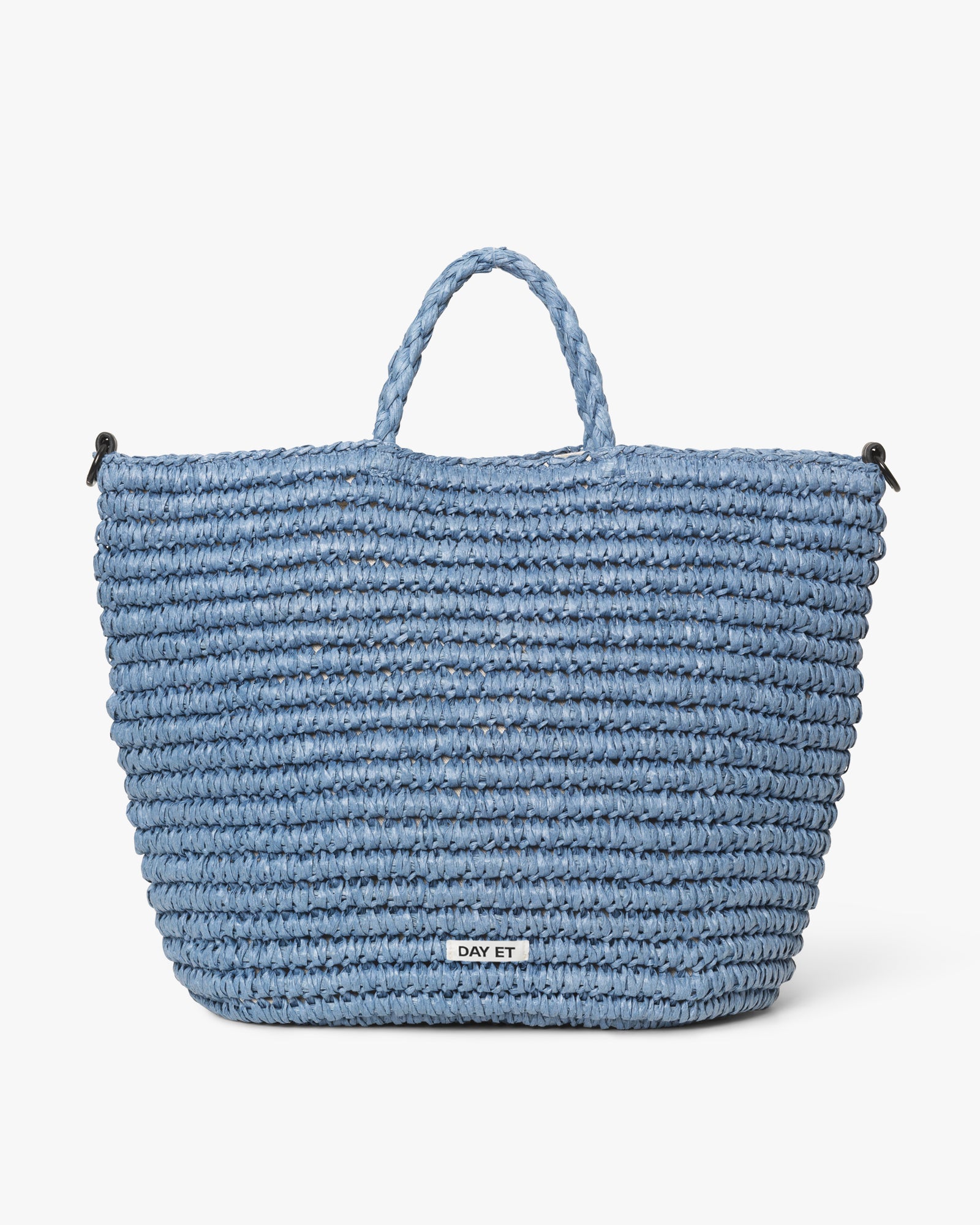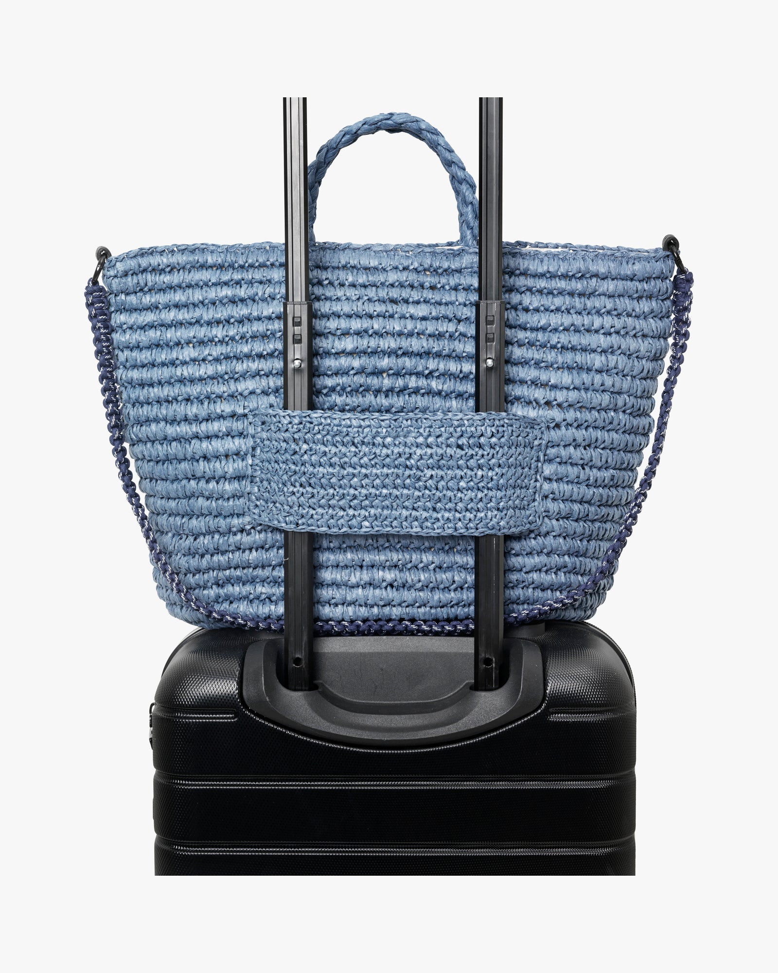 This soft straw bag is designed for travel use and can be carried either by the short handles as a handbag or crossbody with the detachable cord strap. The bag closes with a snap button and has a built-in band on the back for easy attachment to luggage. Inside, it’s lined with beige linen and features a practical side pocket for small items.