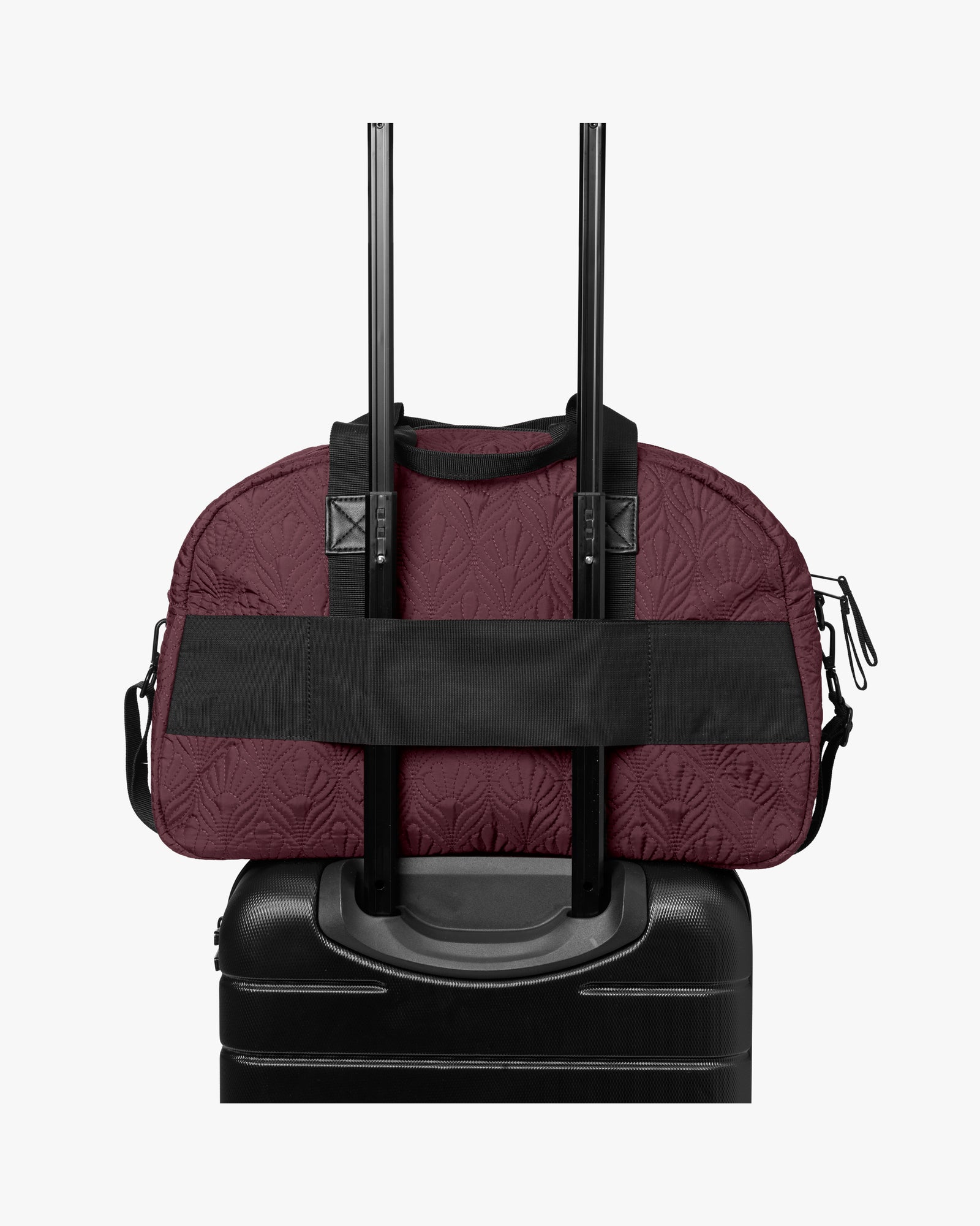 This functional bag with a beautiful quilted pattern is perfect for a weekend getaway. The main compartment fits a 13" laptop and includes multiple pockets to help keep your belongings organised. It features two short handles and a detachable, adjustable strap, allowing you to wear it as a shoulder bag or crossbody. A strap on the back makes it easy to attach to your suitcase, making it ideal for travel. The bag’s outer fabric and lining are made from 100% certified recycled material.