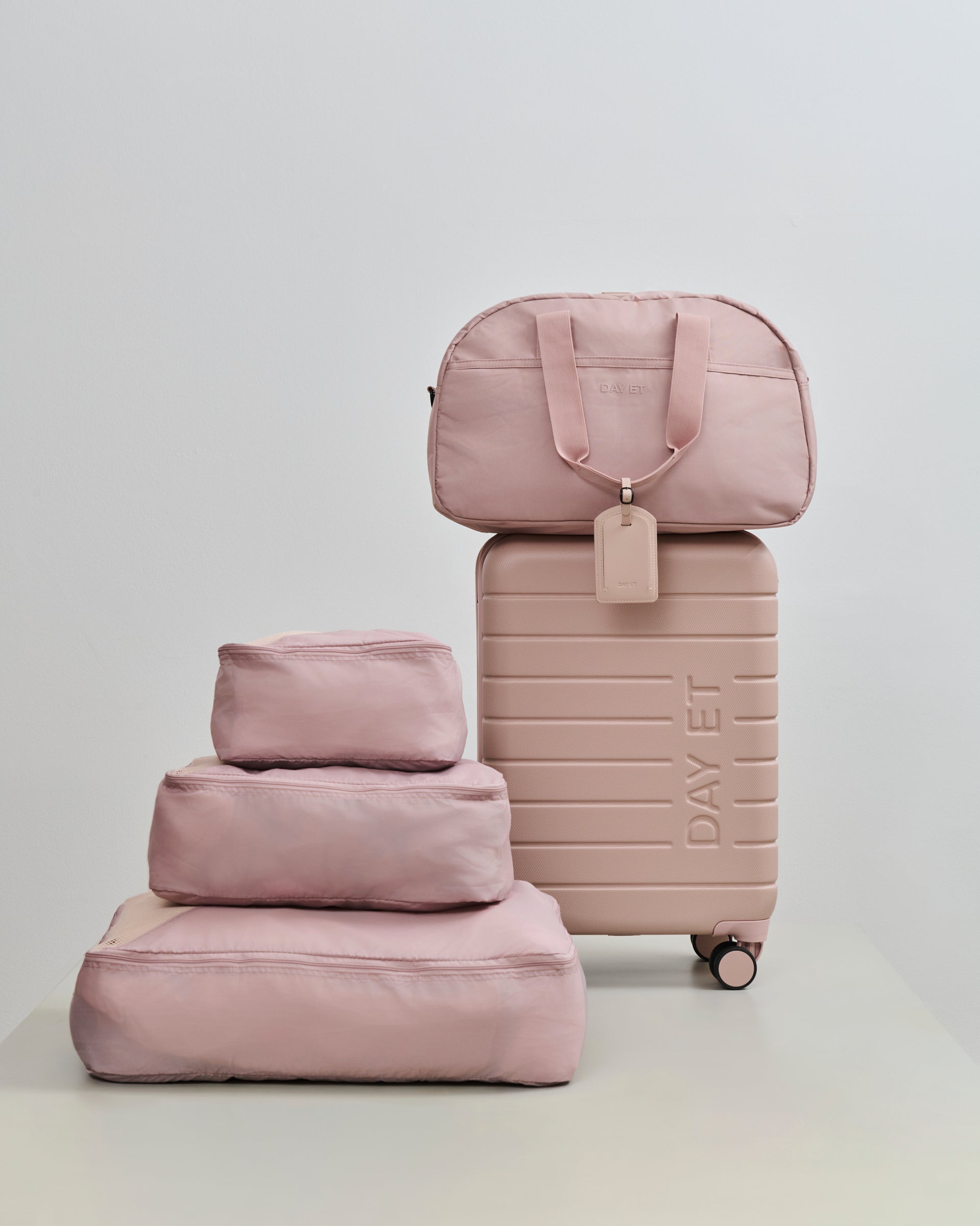 The set includes everything you need for your trip: 1x Day 20" Tonal Suitcase, 1x Large Tonal Nylon 1Nighter Travel Bag, 1x Suitcase Packing Cube Set, and 1x Luggage Tag.