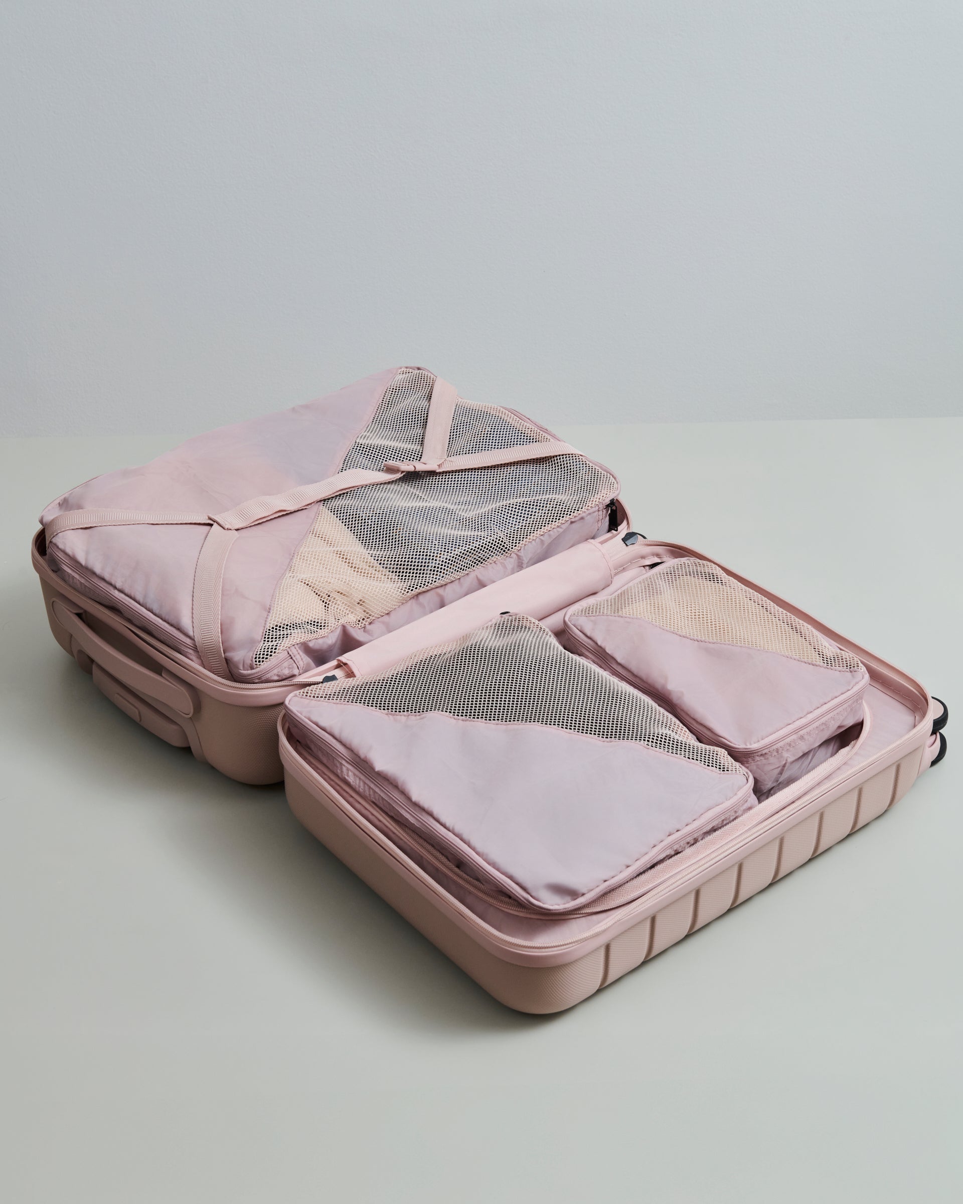 This set is perfect for a city break, combining practical functionality with elegant design. Our 20" suitcase holds 36 litres and is easy to bring along thanks to the four double wheels that rotate 360 degrees. The travel bag can be worn either as a shoulder bag or crossbody bag, and it features a strap on the back so it can easily be attached to the handle of your suitcase. Our packing cubes help you organise your belongings, and with the luggage tag, you can always easily identify your suitcase.