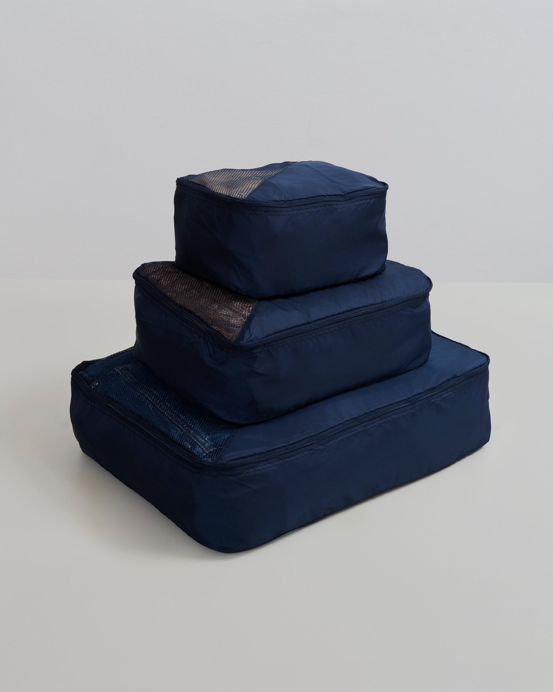 Dette sæt af packing cubes indeholder packing cubes i størrelserne S, M og L. De kan bruges til at organisere dine sager, når du pakker din kuffert, og hovedstoffet er lavet af genanvendt materiale. De lukkes med en lynlås, og øverst på packing cubes er der et net materiale, så du nemt kan se hvad du har pakket.