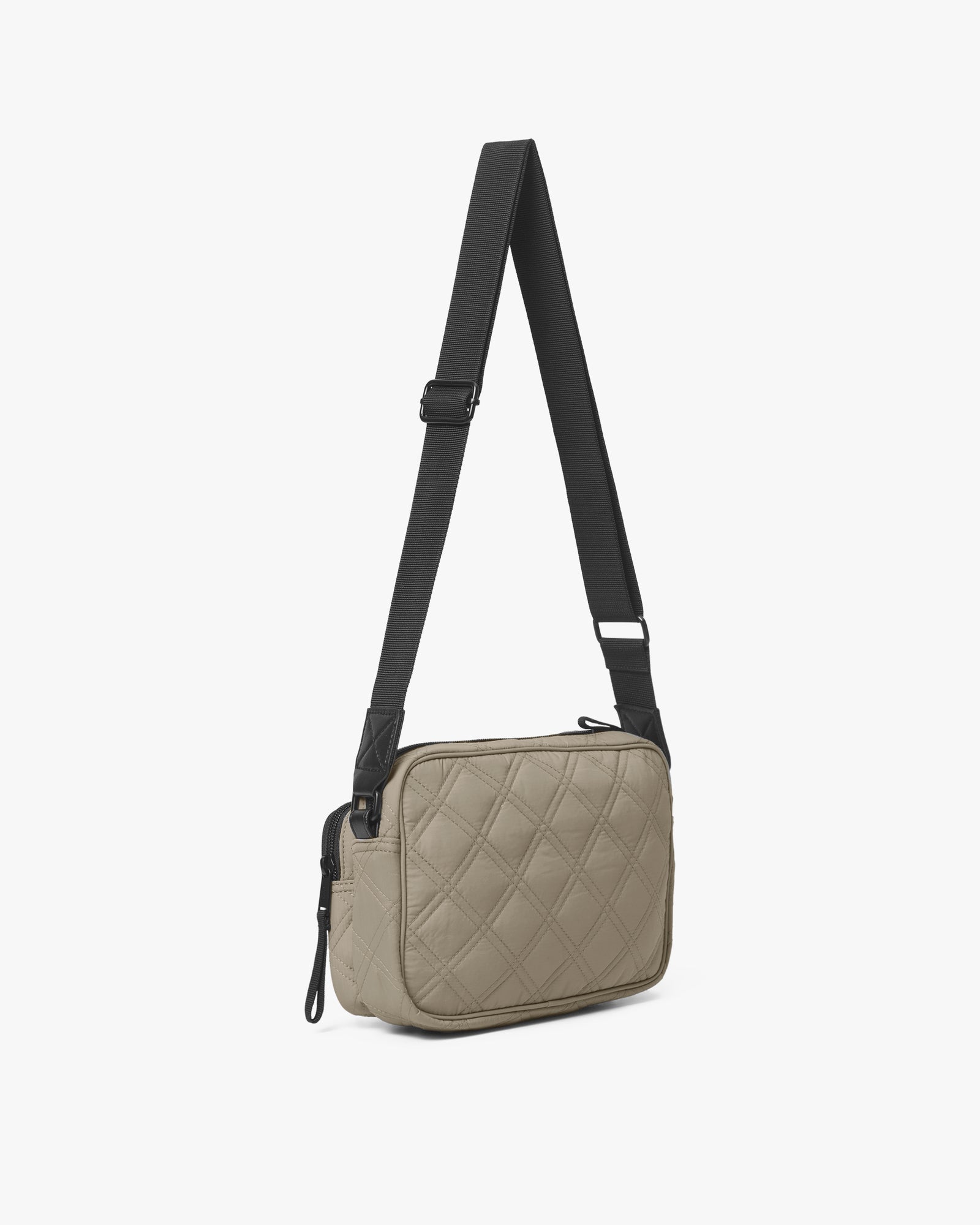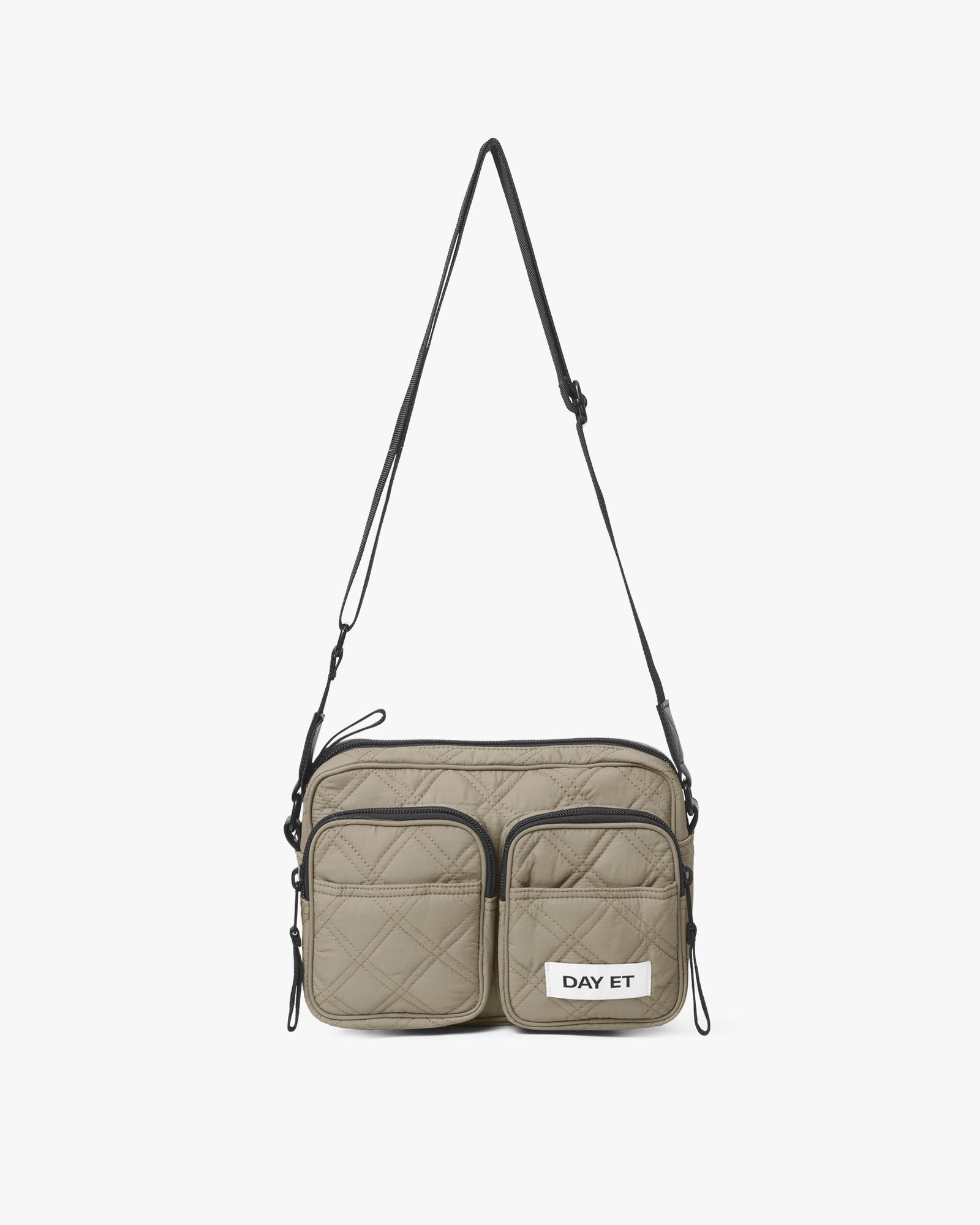 En rummelig taske med mange opbevaringsmuligheder og et quiltet design. Den har to udvendige rum med lynlås, en åben inderlomme og en lynlåslomme. Den kan bæres både som skuldertaske og crossbody. Remmen er justerbar og har fine detaljer i imiteret læder. Taskens yderstof og inderfor er lavet af 100% certificeret genanvendt materiale.
