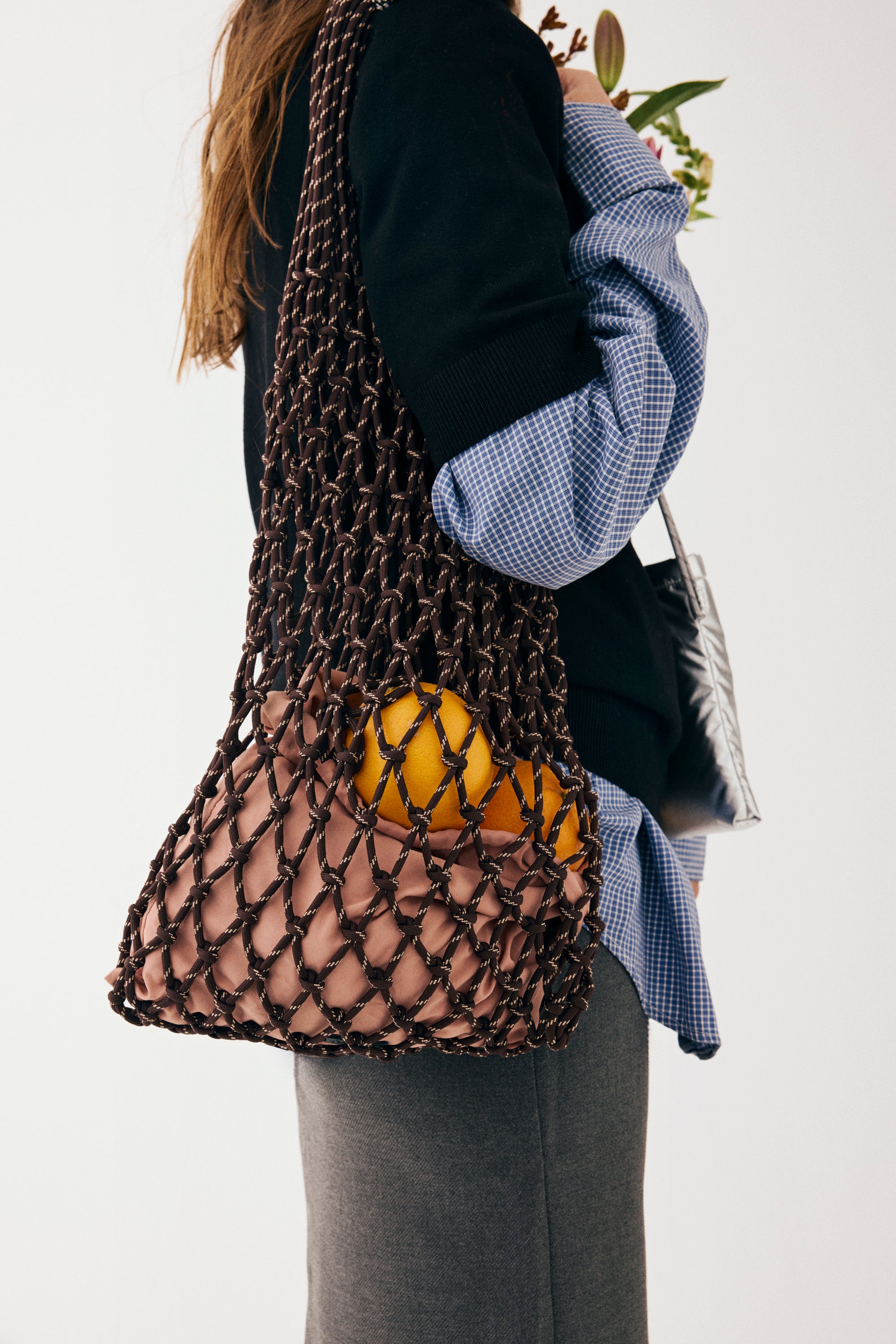 En unik net-taske med karakter og kant. Den er håndflettet i kraftig paracord og udstyret med forstærkede hanke, som gør den behagelig at bære. Indeni finder du en løs stofpose med snørelukning, der holder dine ting sikkert på plads. Et funktionelt design med et grafisk og iøjnefaldende look – ideel som et unikt statement i hverdagen.