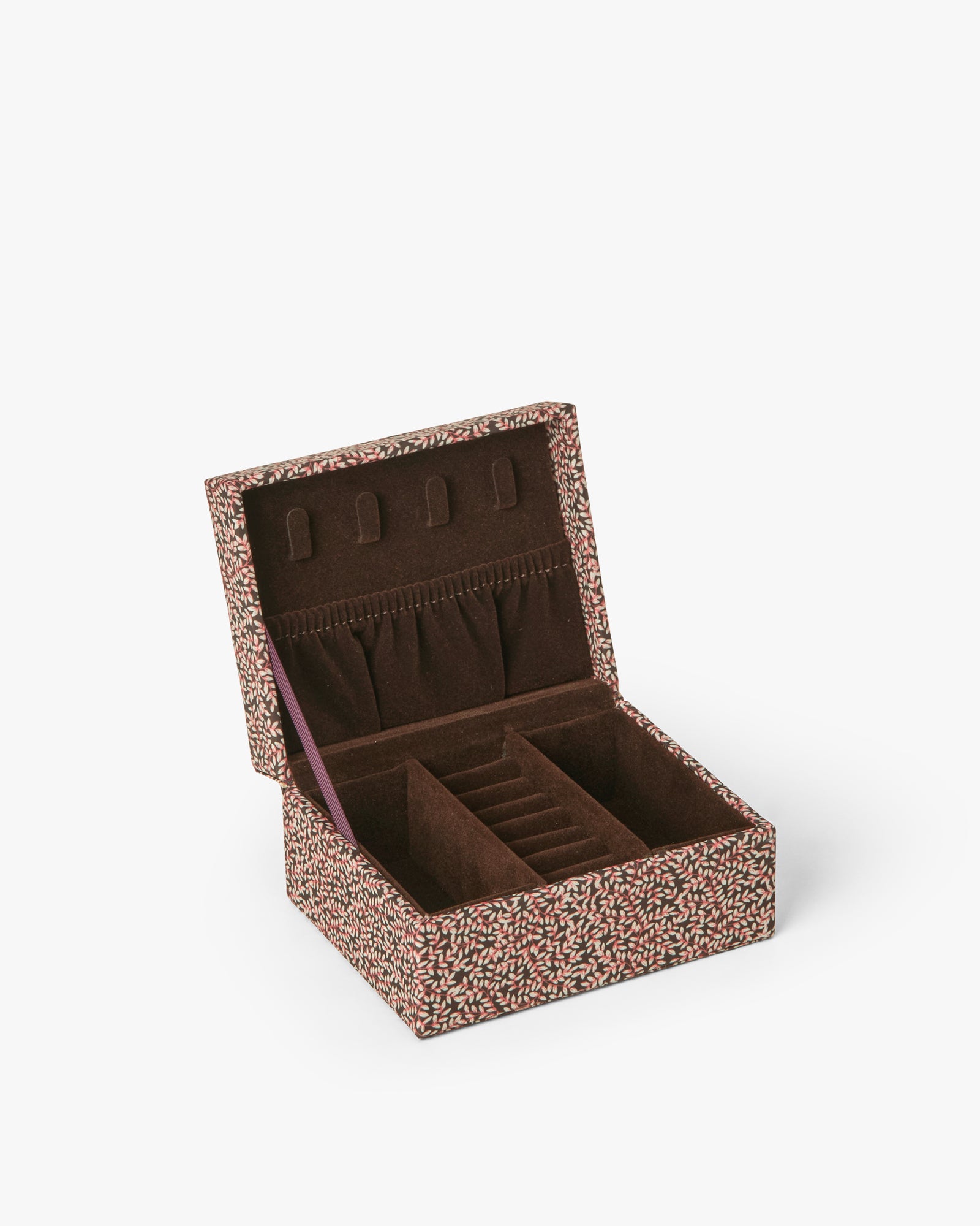 Dette lille smykkeskrin er perfekt til opbevaring af dine yndlingssmykker, både hjemme og på farten. Indvendigt er der flere rum til ringe og øreringe, og i låget er der plads til halskæder. Det er lavet i et fint blomstret print og har magnetisk lukning.