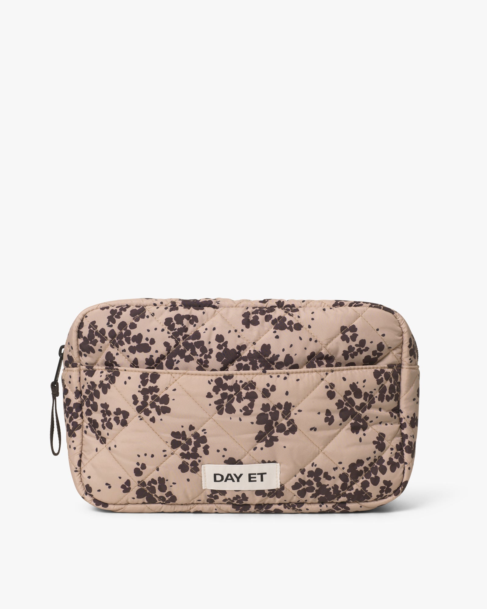 A roomy wash bag in a quilted design with a floral print. It features multiple inner pockets and an outer pocket for easy organisation of your toiletries. The outer fabric and lining are made from 100% certified recycled materials.