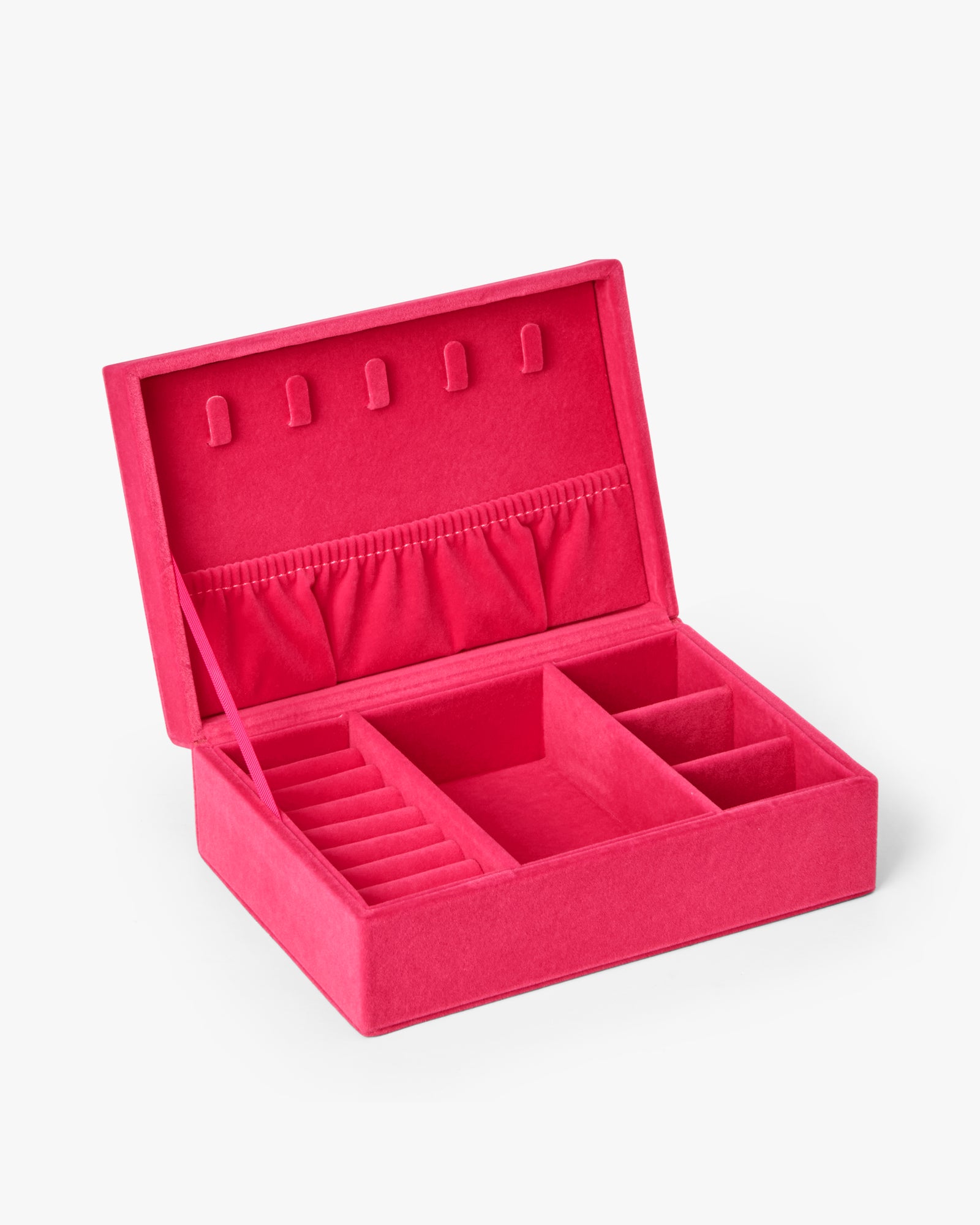 A spacious jewellery box in soft velour. The box has several separate compartments and a section in the lid for necklaces. A magnetic closure and a discreet logo complete the functional design.