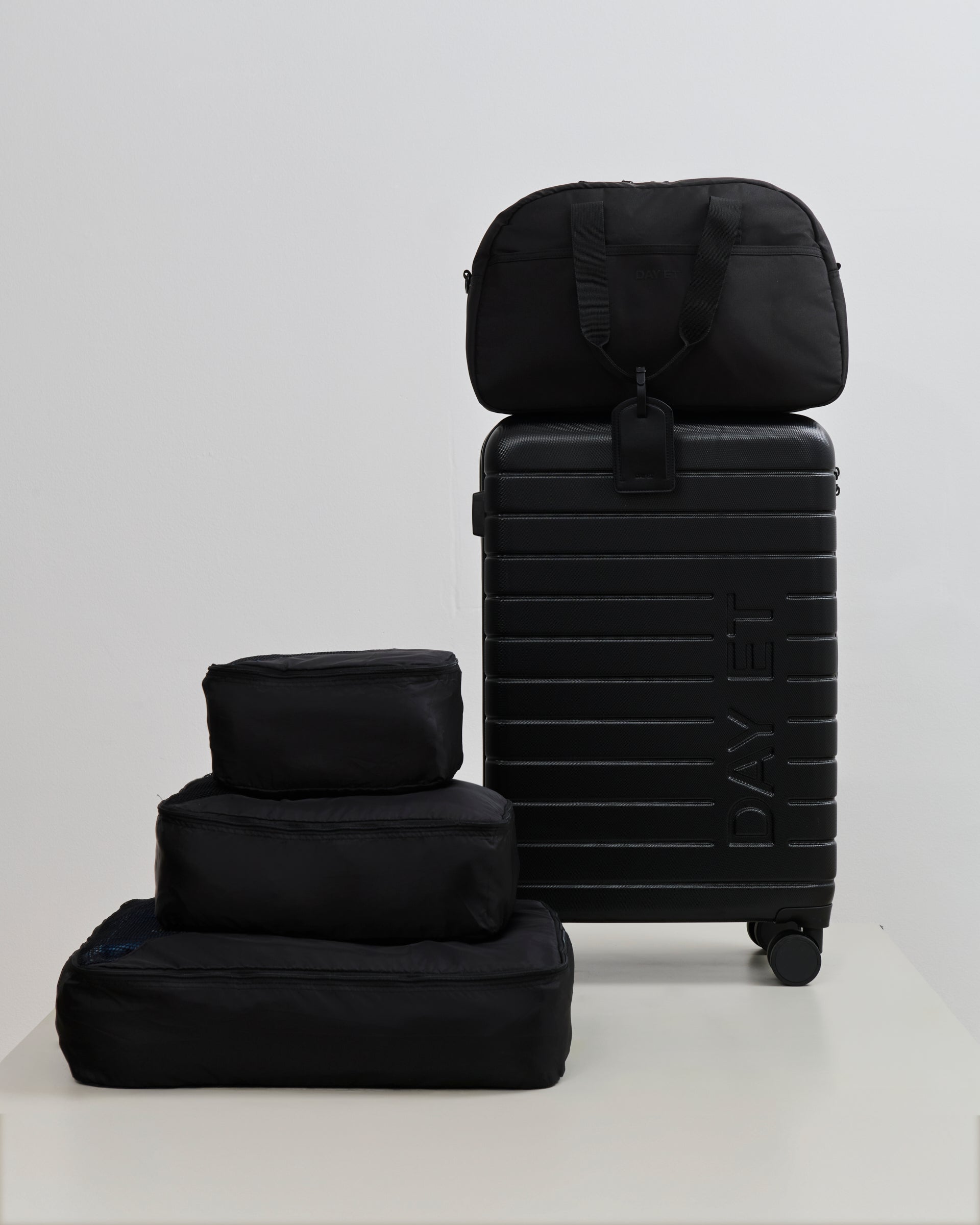 The set includes everything you need for your journey: 1x 24" Tonal Suitcase, 1x Large Tonal Nylon 1Nighter Travel Bag, 1x Suitcase Packing Cube Set, and 1x Luggage Tag.